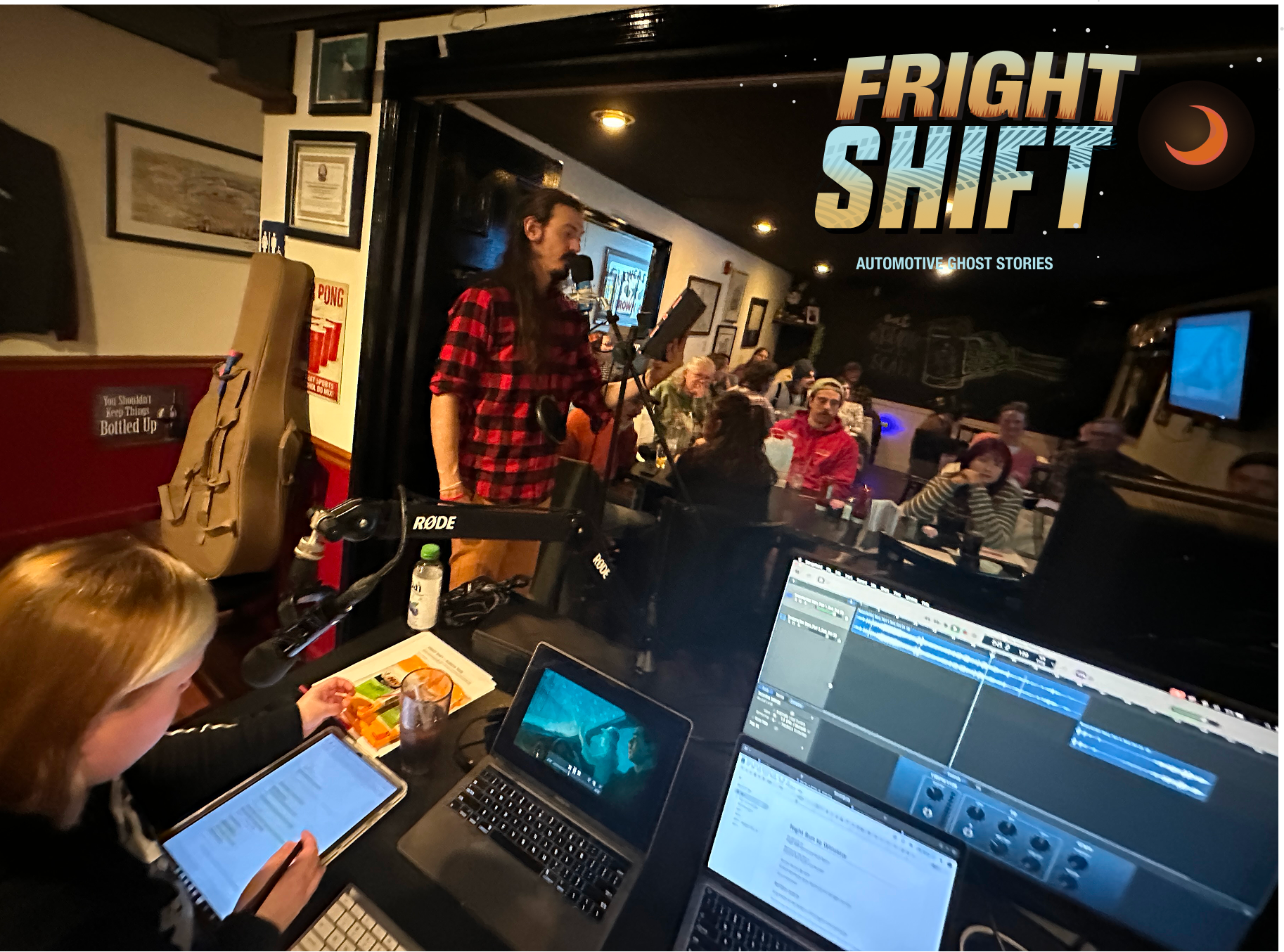 Fright Shift: Automotive Ghost Stories is a live audio-theatre experience where haunted highways collide with car culture. Three voice actors perform 4 original tales— each story includes custom sound effects and music score.
